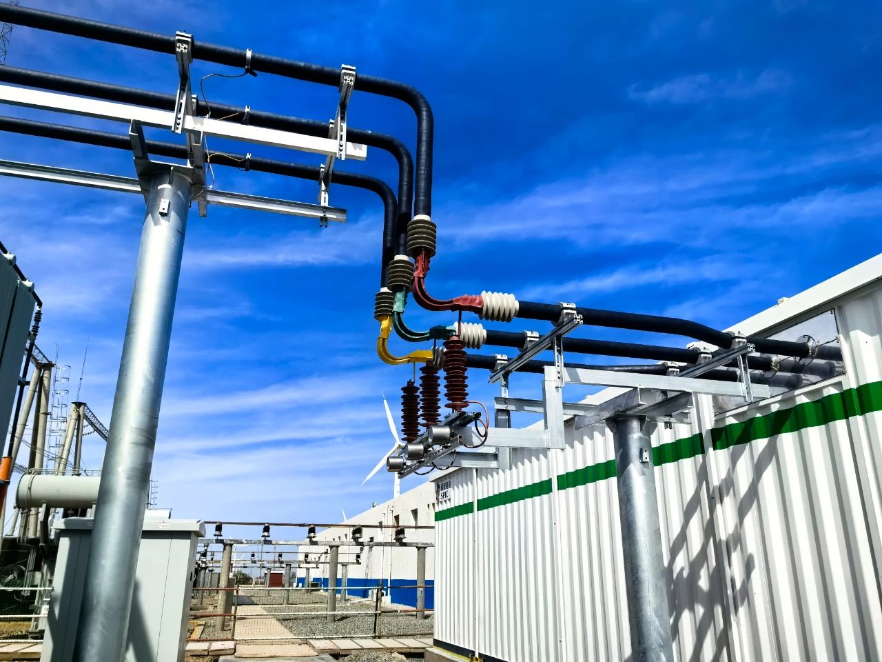 湘能楚天電力集團【天天】訊:“接中調命令:檢查并確認新投設備名稱、編號與規定相符、齊全,標志醒目、完備,新投開關、刀閘、接地刀閘均在斷開位置,現場無閑雜人員、無接地線和其他異常”、“#4主變1104開關冷備用轉熱備用”、“#4SVG3546開關冷備用轉熱備用”、“分別合上3541中電1線、3542中電2線、3543中電3線、3545中儲1線開關向35kV饋線充電三次”、“所有檢修工作已結束,工作票已終結,所有工作已驗收合格,具備轉運行條件”。隨著調度最后一道送電操作指令成功下達,2024年6月6日10時08分,由湘能楚天承建的國家電投中國電力瓜州風電北大橋70MW風電升壓站改造、擴容、儲能配套EPC建設項目(以下簡稱:瓜州項目)成功送電,項目團隊緊密協同、高效配合,密切監視相關設備運行狀態,監控主變壓器、AIS、SVG、站用變壓器等主要設備,圓滿完成送電任務,為甘肅省綠色能源產業發展和“雙碳”目標落實注入新動能。